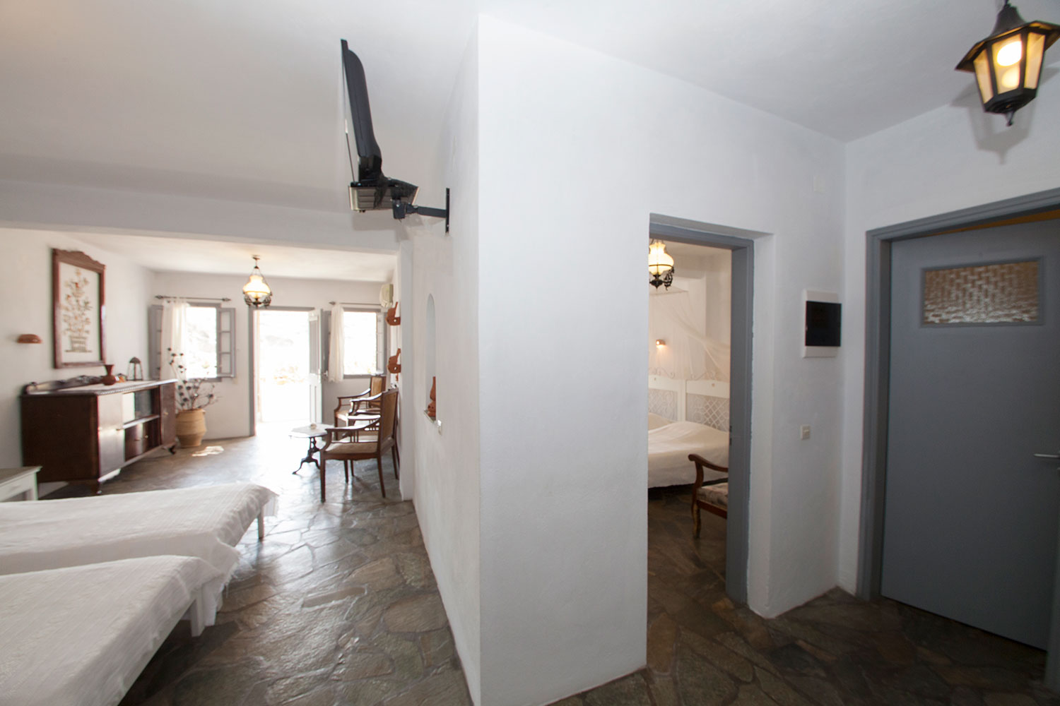 Η διακόσμηση ακολουθεί το αυθεντικό κυκλαδίτικο ύφος, με λευκές επιφάνειες, πλακόστρωτο δάπεδο, καμάρες και χειροποίητες λεπτομέρειες, δημιουργώντας ζεστή και φιλόξενη ατμόσφαιρα.