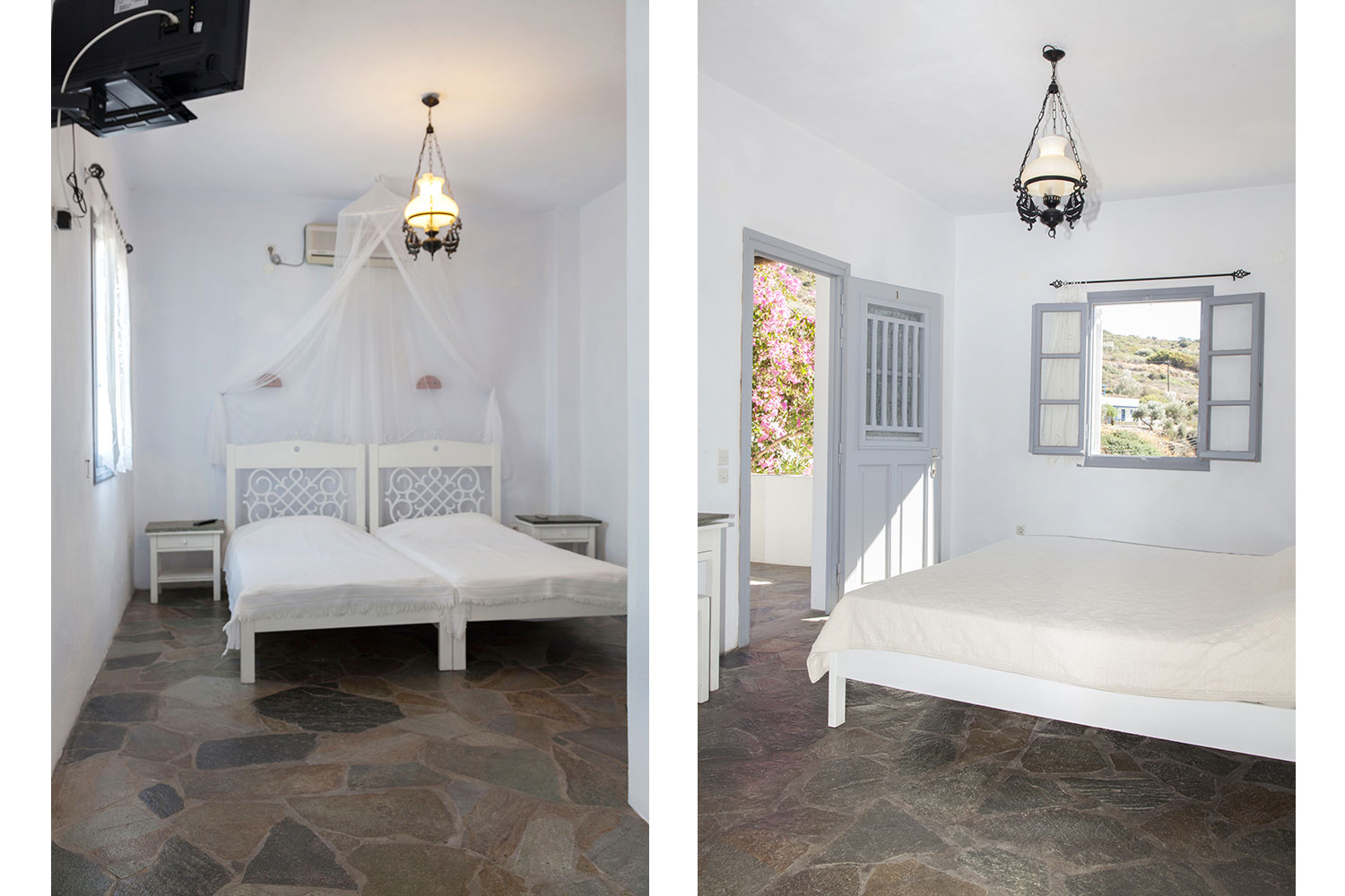 Ο φωτεινός ενιαίος χώρος διαθέτει δύο άνετα κρεβάτια, παραδοσιακή διακόσμηση, πλακόστρωτο δάπεδο και προσεγμένες λεπτομέρειες που δημιουργούν αίσθηση χαλάρωσης. Όλα τα δίκλινα στούντιο προσφέρουν θέα στη θάλασσα ή στον κήπο και φυσικό φως.