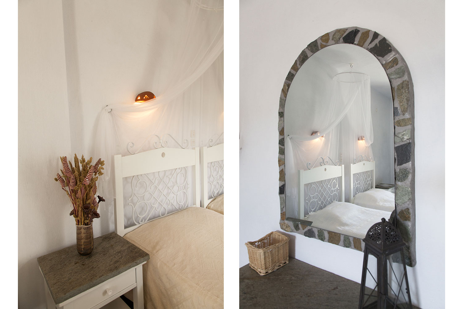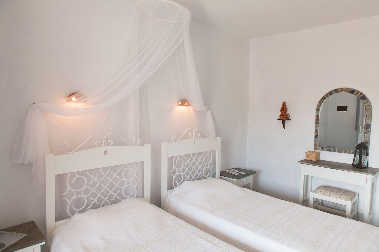 Ο ενιαίος χώρος είναι ευρύχωρος και φωτεινός, με προσεγμένη κυκλαδίτικη διακόσμηση, πέτρινα δάπεδα και παραδοσιακές λεπτομέρειες. Η διάταξη των κρεβατιών προσφέρει άνεση και ευελιξία, χωρίς να χάνεται η αίσθηση ηρεμίας και ξεκούρασης.